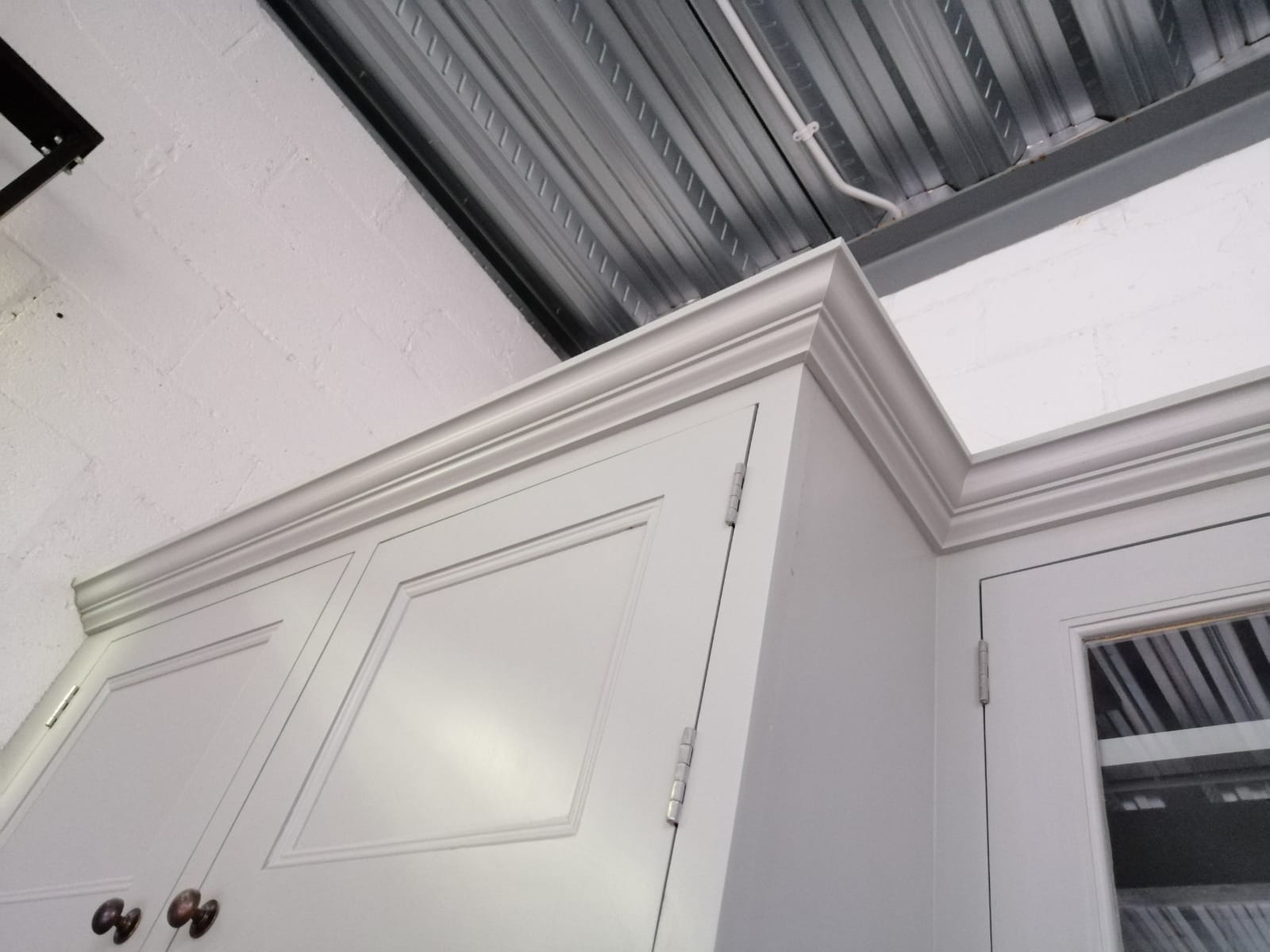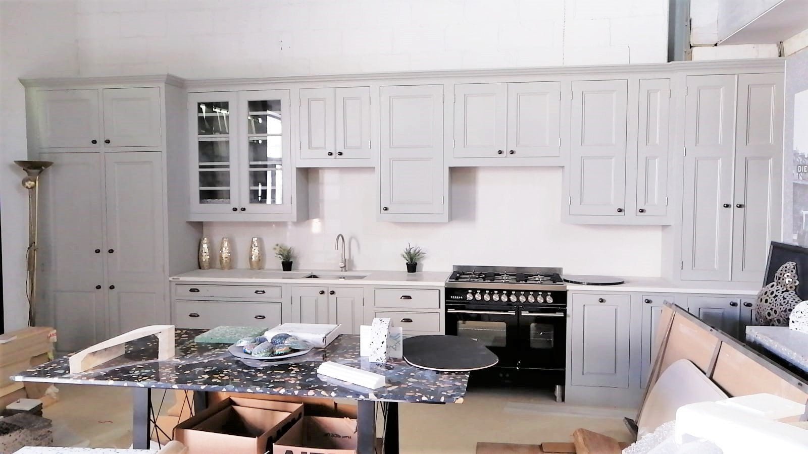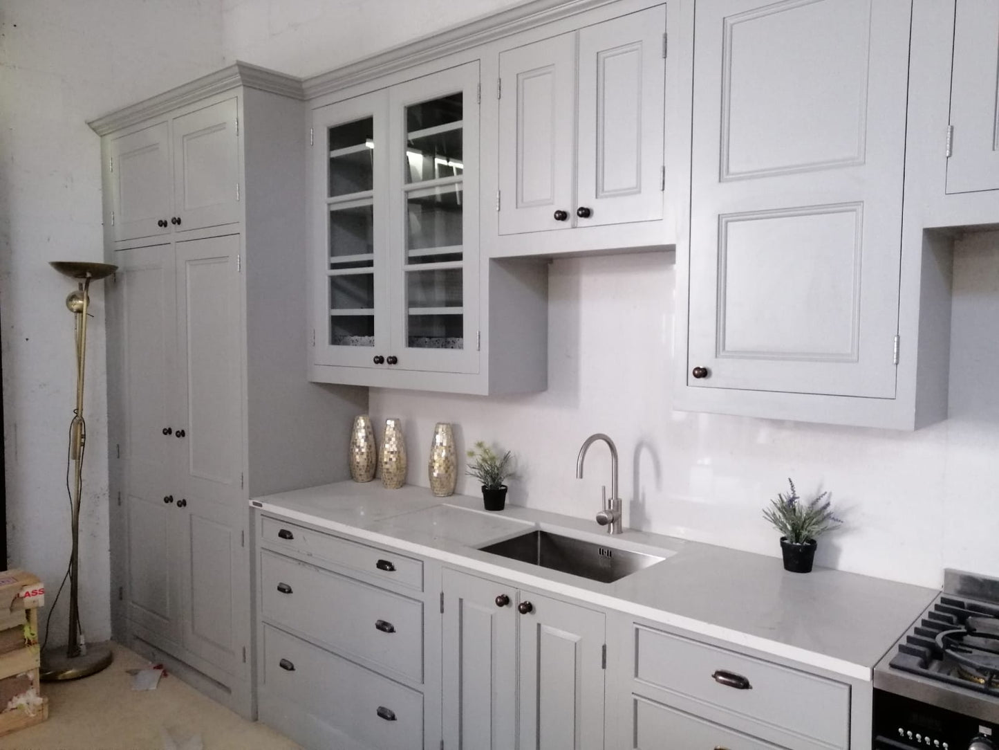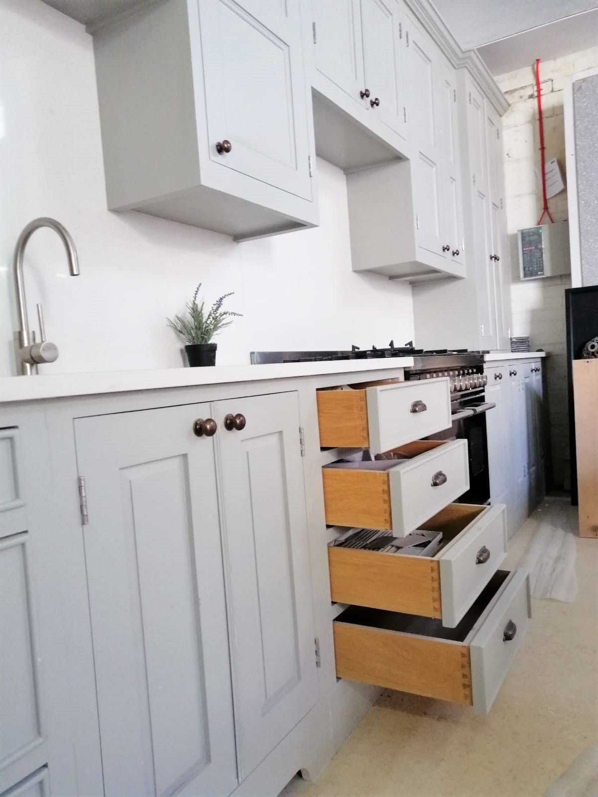 Made from oak veneered carcasses on a moisture resistant MDF. The doors and frames made from solid 32 mm tulip finishing around 28 mm It’s hand painted . The cupboard on the far right is a larder cupboard fitted with small drawers and adjustable shelving .The tall cupboard on the left is fitted with sliding drawers all in solid oak . All shelves are lipped front and back with solid oak.